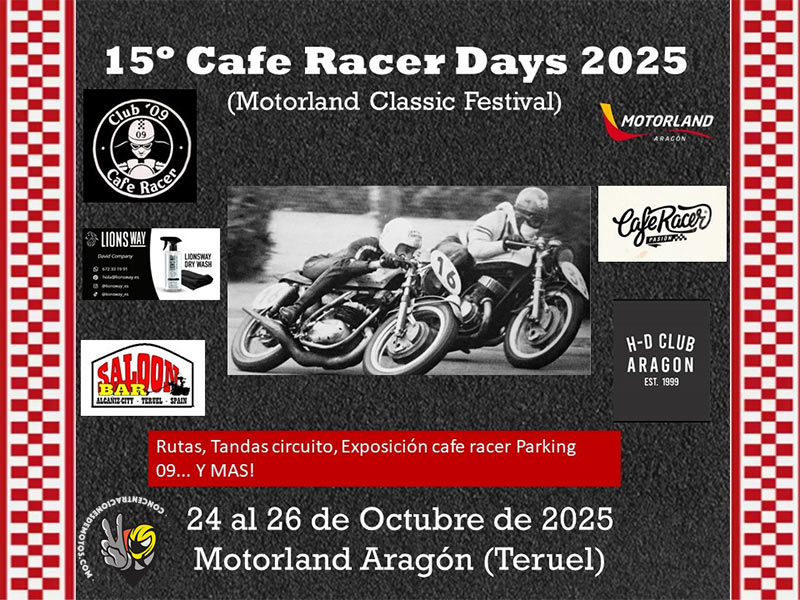 Por decimoquinta vez, el Club Café Racer 09 celebra sus ya míticos Racer Days, y como en las últimas ediciones, el escenario será el Circuito Motorland de Alcañiz (Teruel), coincidiendo con el Motorland Classic Festival.