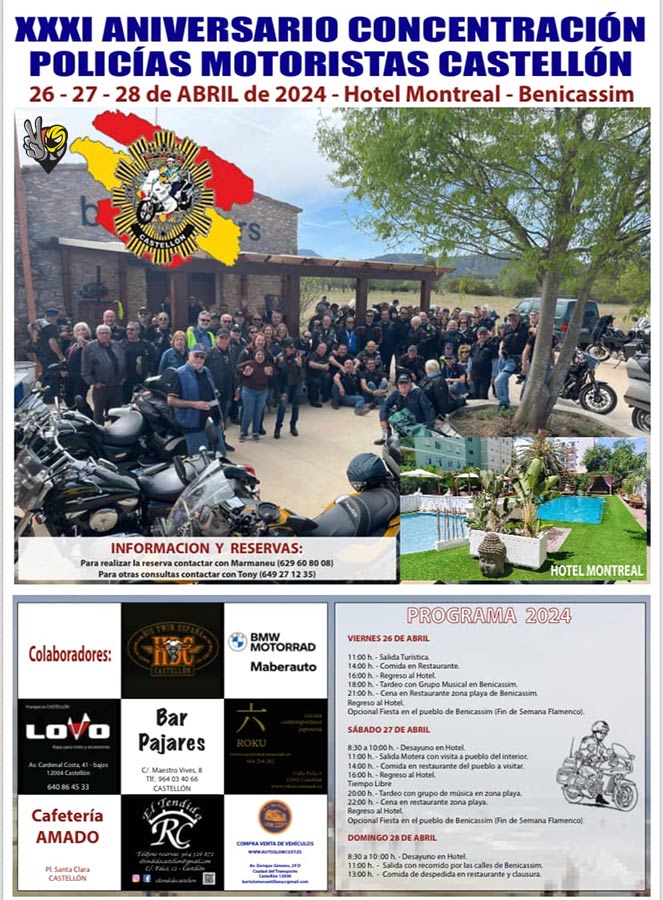Te esperamos en Benicàssim para el 31º Aniversario Concentración Policías Motoristas de Castellón 2024 que celebraremos en el Hotel Montreal.