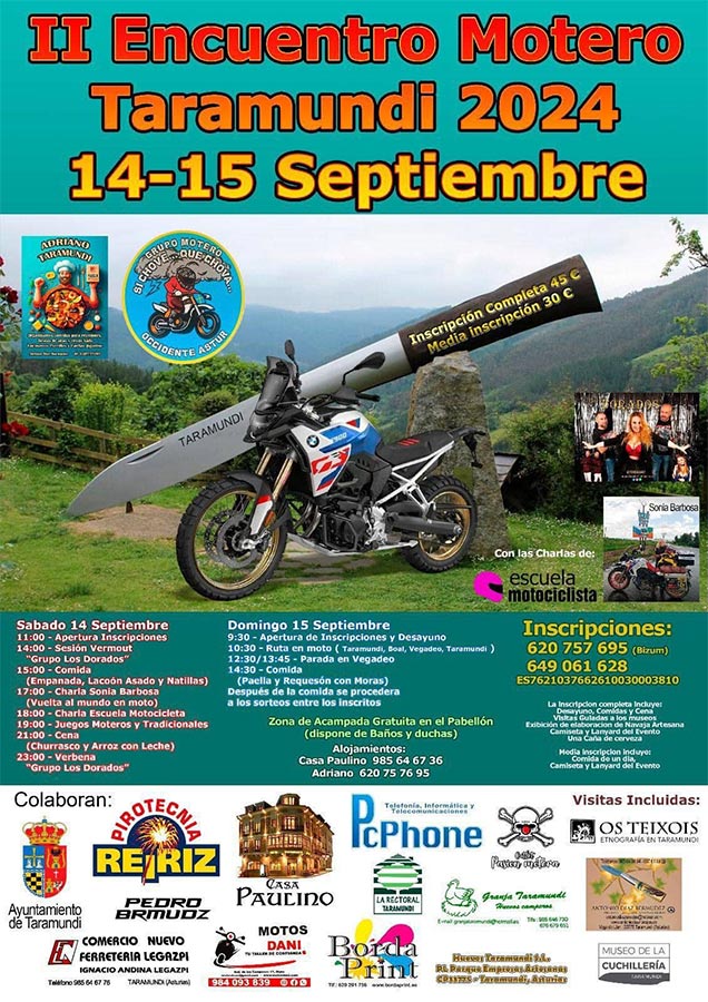 Tenemos preparadas un montón de actividades: rutas en moto por bellos parajes, charlas instructivas, comida, cena, desayuno, juegos moteros, visitas a museos, sorteo de regalos, inscripción con camiseta, concierto el domingo, etc.