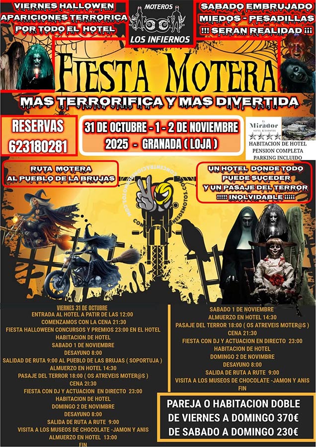 Del 31 de octubre al 2 de noviembre de 2025, el Moto Club Los Infiernos te invita a vivir una experiencia inolvidable en Loja (Granada), en el Hotel Mirador, con pensión completa y parking incluido.
