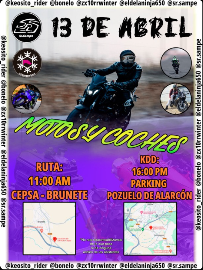 Apúntate a rodar con nosotros en esta kedada y Ruta el 13 de Abril en Madrid, TANTO COCHES COMO MOTOS.