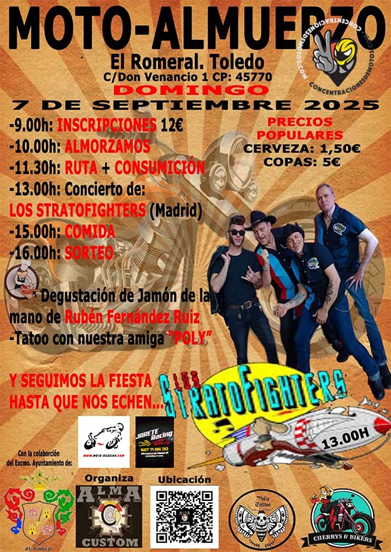 Organiza Alma Custom, con la colaboración del Excmo. Ayuntamiento de El Romeral y otros colectivos moteros. La ubicación del evento está disponible mediante código QR en el cartel. ¡Nos vemos en la carretera!