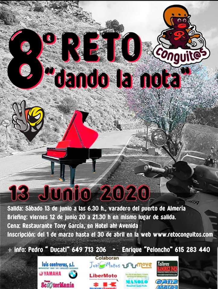 Ya tenemos en marcha la nueva edición, ya puedes hacer la inscripción (hasta el 30 de abril de 2020) del VIII Reto Conguitos «Dando la Nota« que se celebrará el próximo 13 de junio en Almería y que nos llevará a recorrer más de 700 kilómetros.