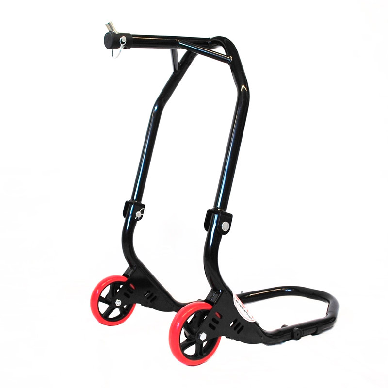 Caballete de alta calidad válido para circuito profesional fabricado en tubo de hierro de 35 mm y con ruedas de silicona de 135 mm, también se incluyen 5 adaptadores para diferentes medidas de tija inferior. (No válido para motos Ducati)